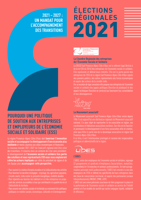 Ainsi, en région Provence-Alpes-Côte d’Azur, l’UDES s’associe à la Chambre Régionale de l’Economie Sociale et Solidaire et au Mouvement Associatif Sud - PACA pour adresser un plaidoyer commun aux candidats des prochaines élections régionales. Ces mesures visent à mettre les entreprises sociales et solidaires au cœur de l’économie locale à travers quatre propositions prioritaires :