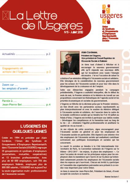 La prochaine tenue de la Convention nationale de l'Usgeres, les emplois d'avenir, la signature d'une déclaration paritaire sur l'emploi des jeunes ... autant de sujets abordés dans ce cinquième numéro. Jean-Pierre Bel, Président du Sénat répond aux questions de La Lettre de l'Usgeres.