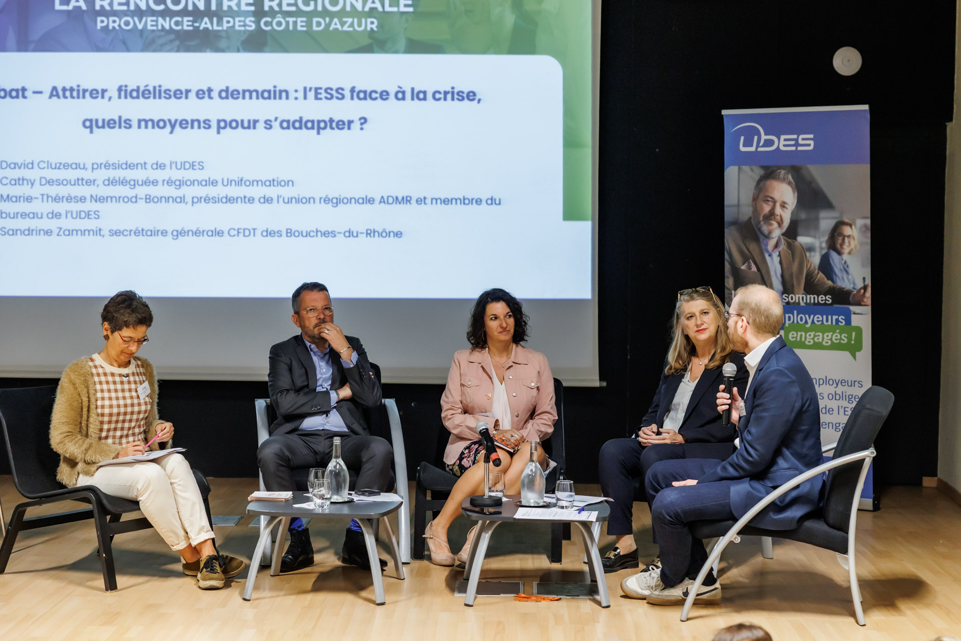 La première a réuni David Cluzeau, Marie-Thérèse Nemrod Bonnal (présidente de l’ADMR 84 et administratrice de l’UDES), Cathy Desoutter (déléguée régionale d’Uniformation) et Sandrine Zammit (secrétaire générale de la CFDT des Bouches-du-Rhône). Animée par Charles Bozonnet, cette rencontre a offert un espace d’échanges autour des leviers dont dispose l’ESS) pour attirer, fidéliser et s’adapter aux défis actuels.